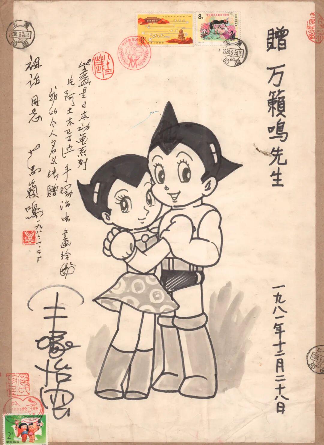 手家治虫视万籁鸣为精神偶像,1981年,他来访中国,赠予万籁鸣先生一幅阿童木兄妹签绘,后来这件作品被贴上邮票寄出,历经风霜又回到中国。这是中日两国动漫文化交流的重要物证,珍藏于JC动漫馆。