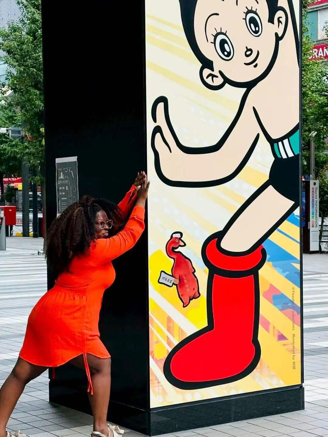 展览现场巨大的主视觉画作,吸引了众多来自世界各地游客的目光,这幅画正是由金城应邀为展览创作的《孙悟空与阿童木》。