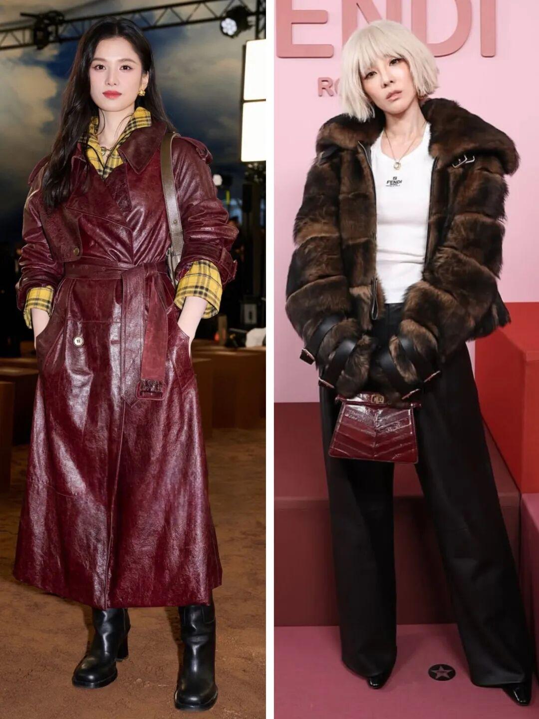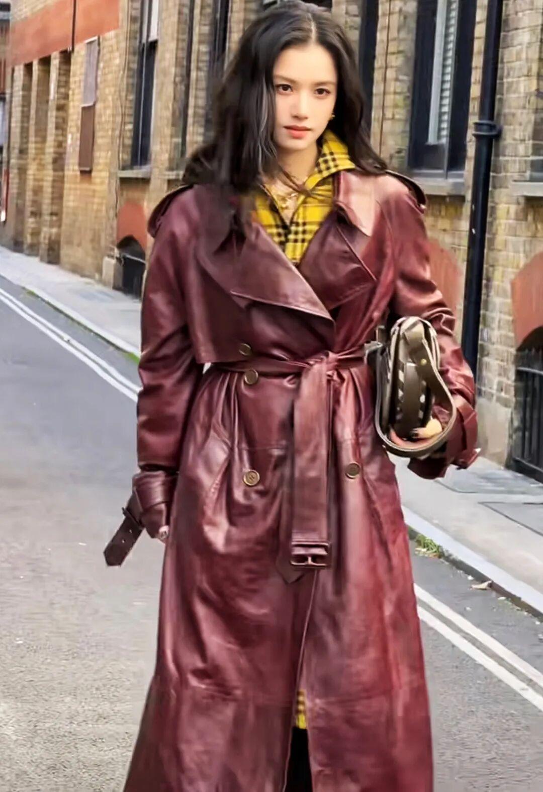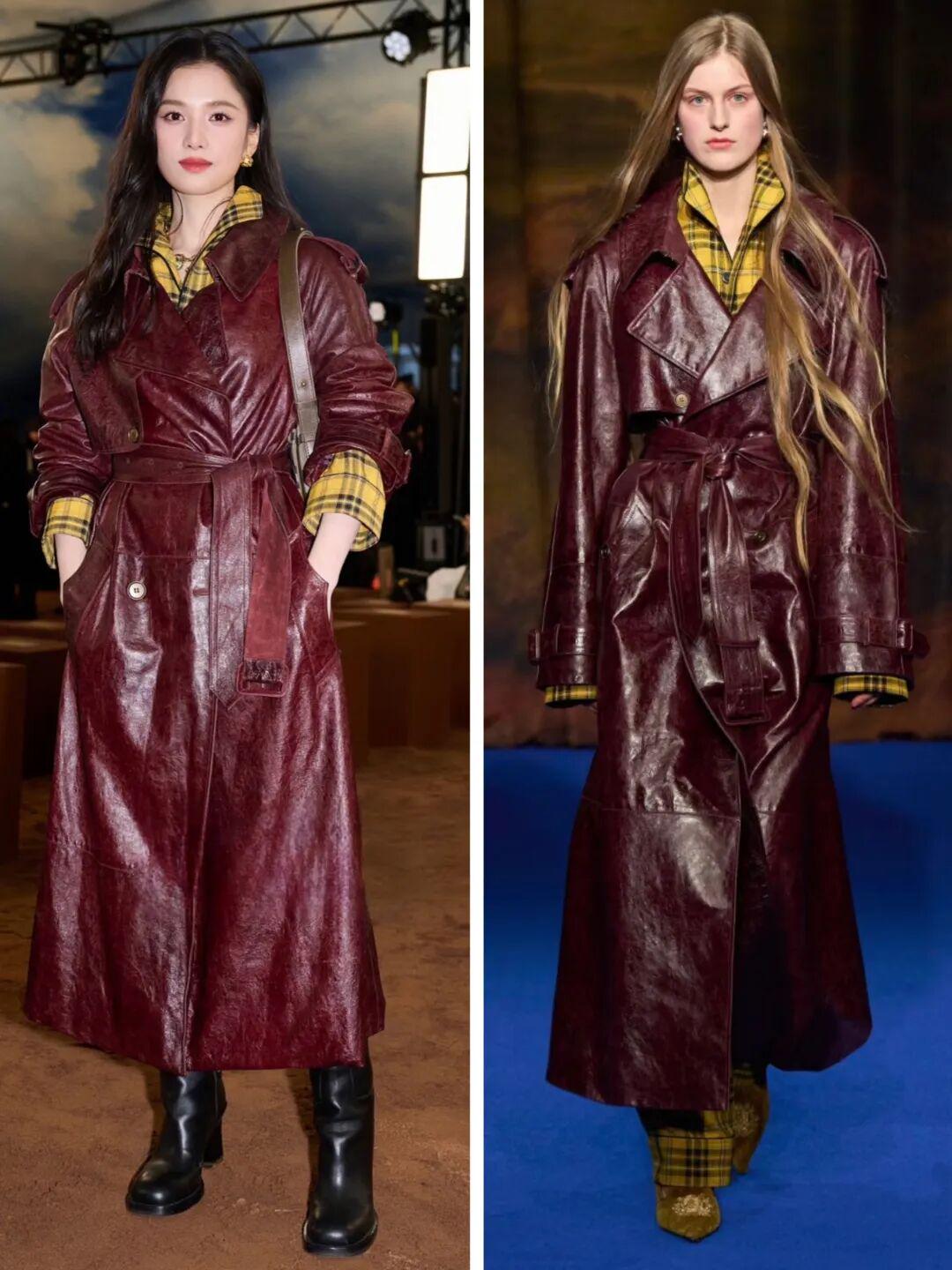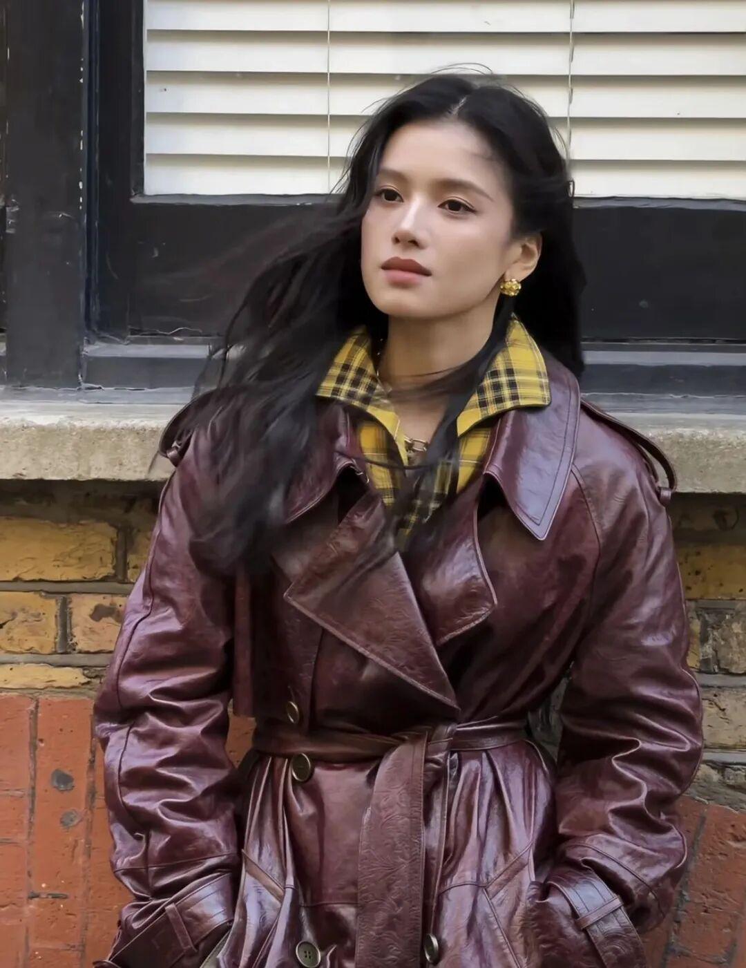 张婧仪这套我也很喜欢。酒红色皮风衣配姜黄色格子衬衫,配色大胆、效果惊艳。