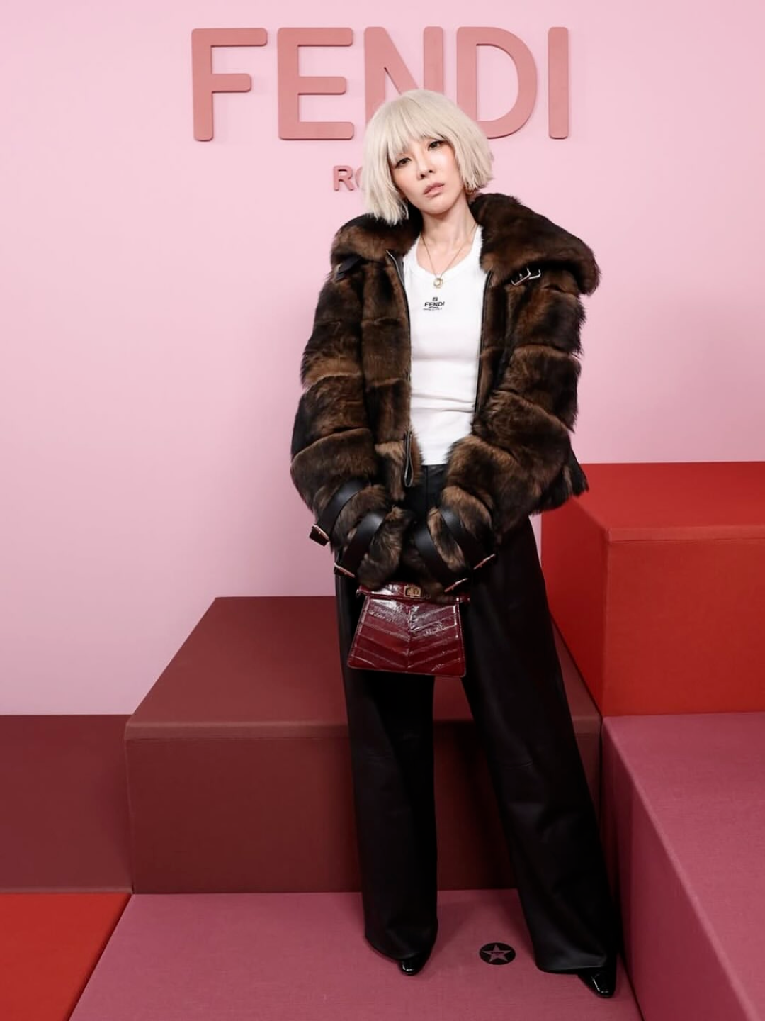 好了,来看看同场的韩娱女星朴山多拉。我估计她是想走有钱坏女孩路线。But,实际上却像是韩剧里的财阀坏婆婆,从假发到包包,全身上下每样单品都是道具。