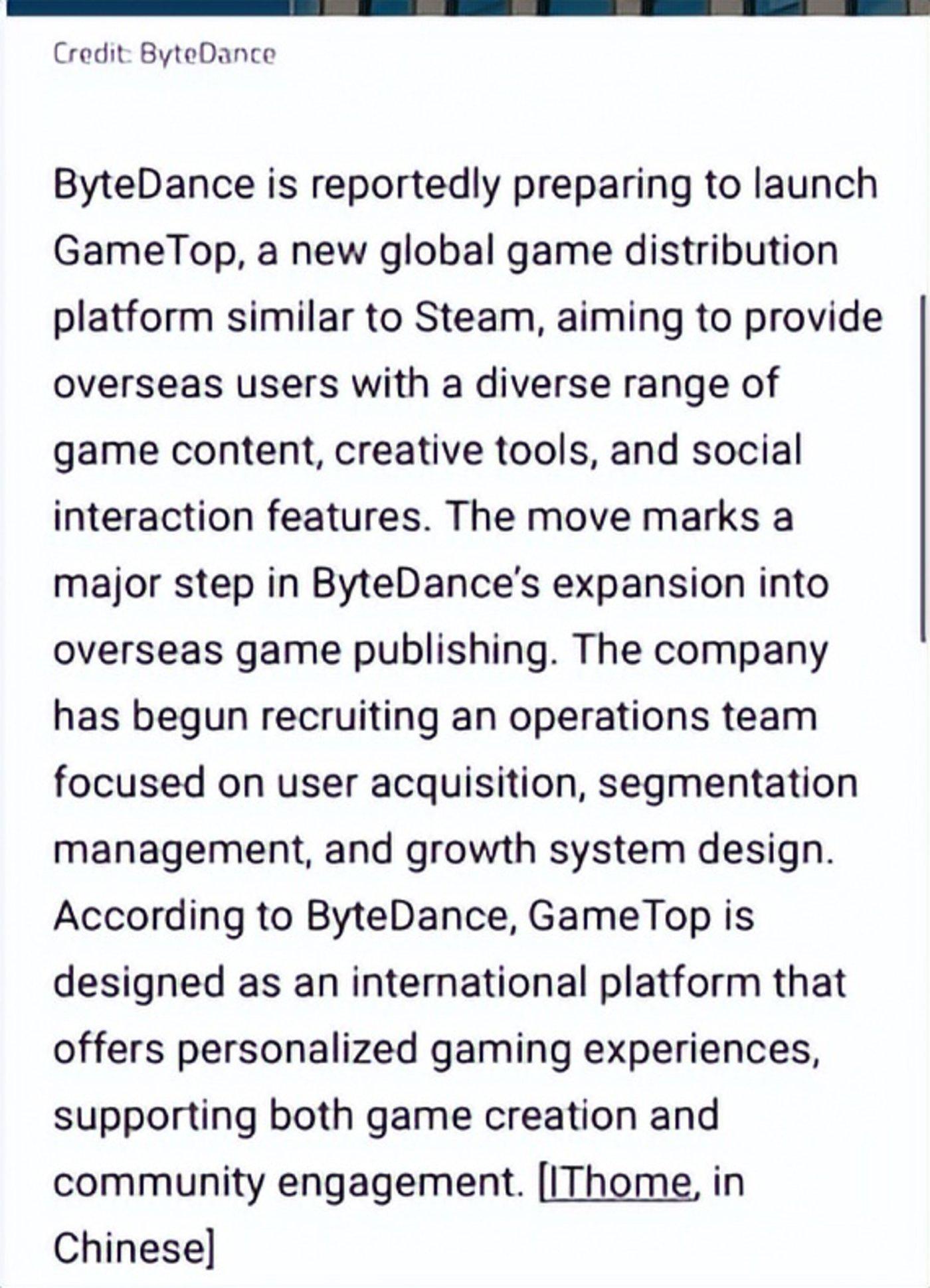 最近,据外媒technode消息,字节计划在海外市场推出一个全新的游戏发行平台,命名为「GameTop」。